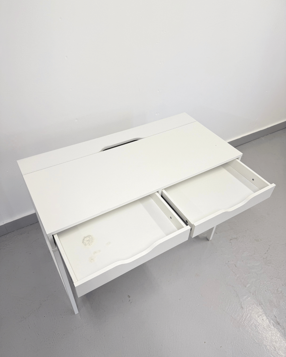 White Desk with 2 storage drawers, one of the drawers contains some damage on the inside (see photos)